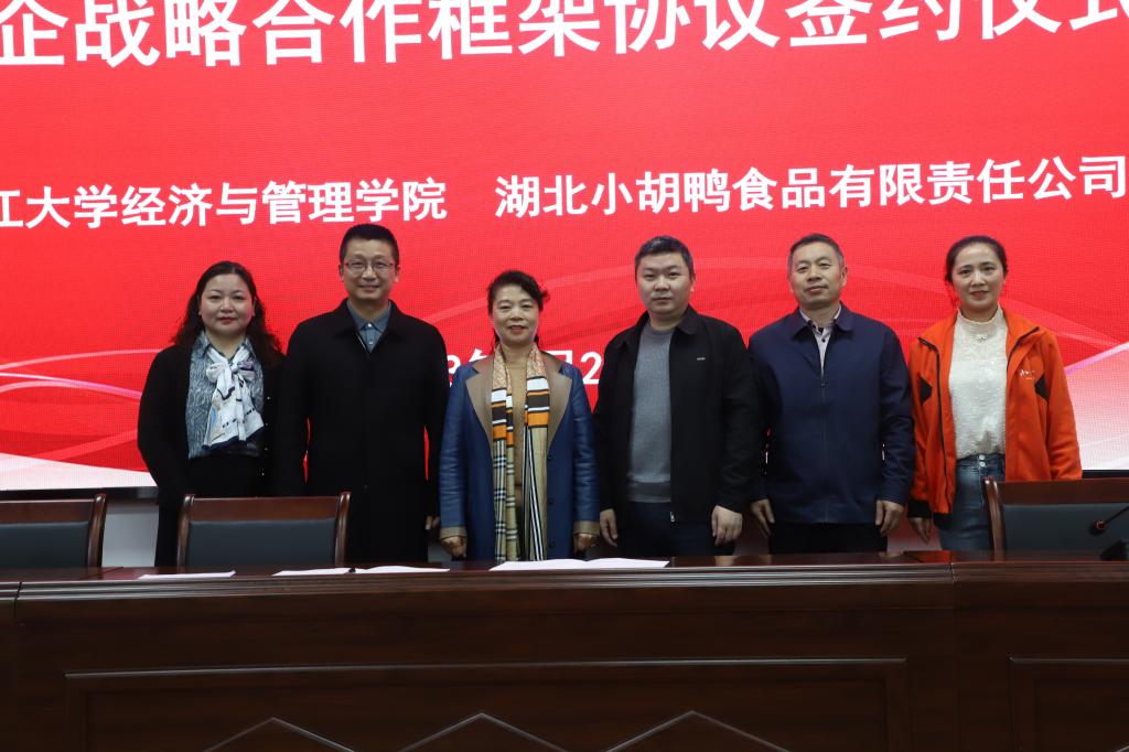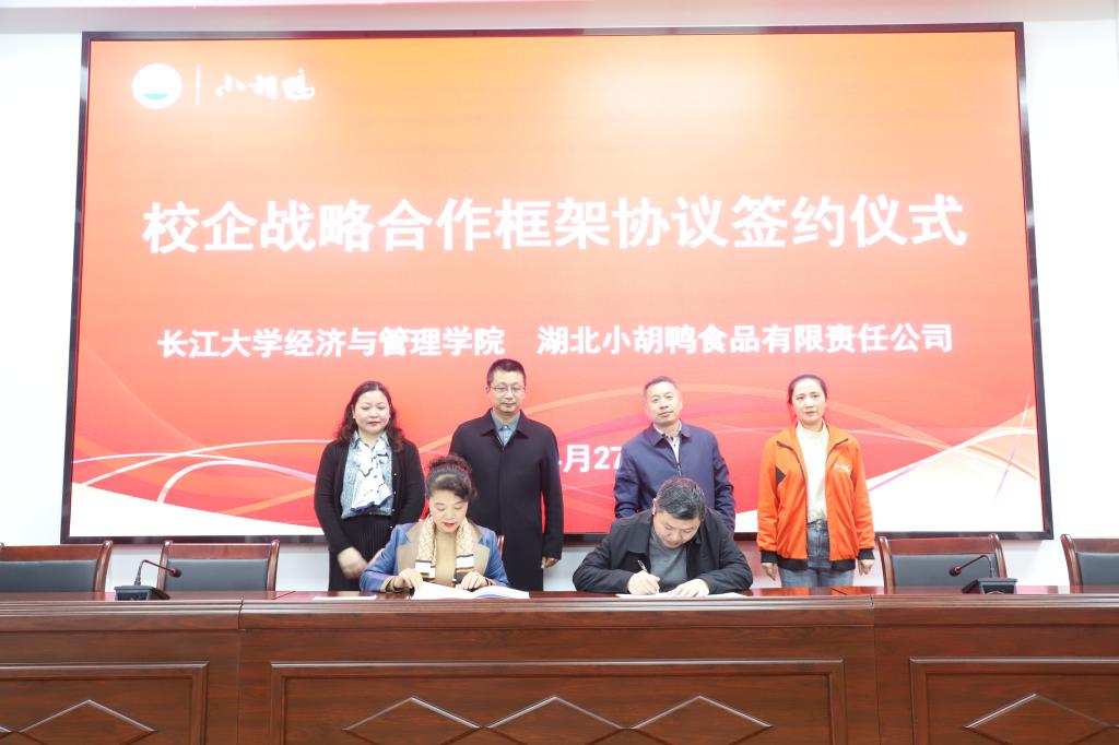 (通讯员 黄胜胜 彭文桦)2023年4月27日,公司与湖北小胡鸭食品有限责任公司校企战略合作框架协议签约仪式在公司15教学术报告厅举行。小胡鸭董事长胡秀容,董事长助理陈思才,党支部书记陈海燕,宣传部长姚瑜出席签约式,公司经理徐辉,副经理陈承,副书记王中梅及公司25名教师代表,200名员工代表参加签约仪式及励志报告会。