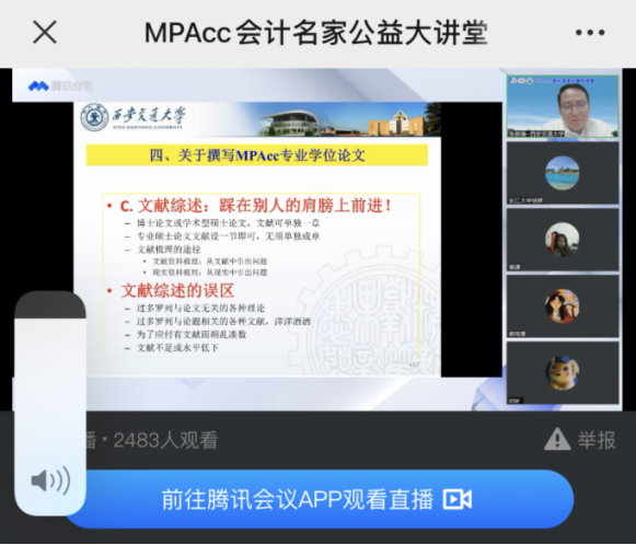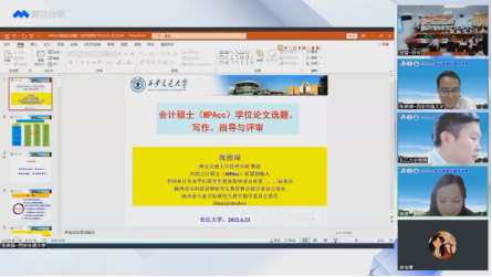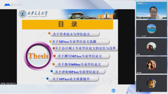 张教授则首先感谢了中国会计学会、全国会计专业学位研究生教育指导委员会和304永利集团登录入口提供的这次交流机会,并祝贺公司会计学成为国家级一流本科专业建设点;随后,他从学术论文与学位论文的区别谈起,给出了MPAcc学位论文研究类型的选择建议,重点对MPAcc学位论文的选题、定位与边界进行了阐述,指出MPAcc学位论文应紧密结合会计实务;接着,张教授围绕MPAcc学位论文的撰写、指导与评审三个方面分别结合实际案例列举了许多共性问题,并为解决以上问题、提升MPAcc学位论文质量提供了一系列建议;最后,师生们与张教授就MPAcc学位论文写作的相关问题进行了积极的线上交流与互动。