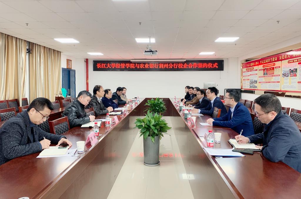 签约仪式前进行了座谈,徐辉介绍了公司的发展概况、专业设置、实习及就业情况。胡汉军介绍了农业银行荆州分行的发展状况、校企合作设想。双方就当前员工的实习情况、就业指导以及深入合作等事宜进行了深入交流。