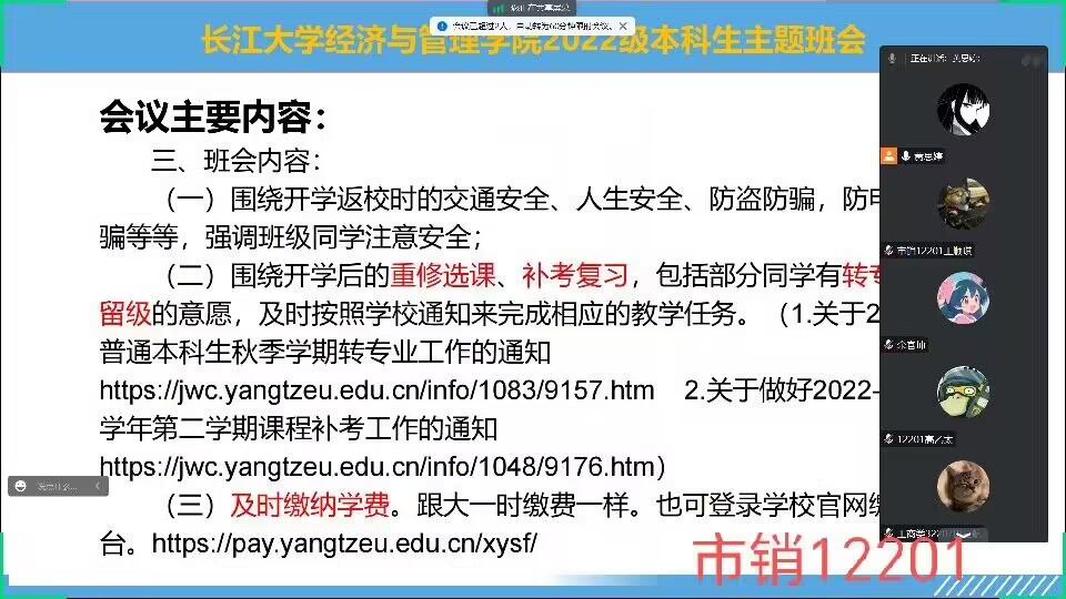 会议开始,首先由班主任强调了返校时间,如遇特殊情况推迟返校需向辅导员请假报备;全体同学要重视返校人身安全,谨防电信诈骗;随后针对不同年级的员工,开展了学业教育,新生班主任表示希望同学们可以尽快适应老员工活,要抓紧时间,争取在新的学习生涯中取得优异的成绩;毕业年级班主任强调要处理好课程修读与考研、就业的关系,关注自身学业状态,确保能顺利毕业;其他低年级员工要不断总结,奋发向上,以最佳的状态投入到新学期的学习中去。