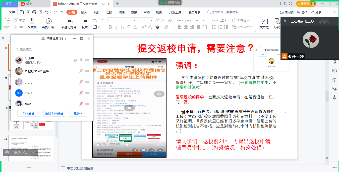 会上,主持人首先引导同学们认真学习了《新型冠状病毒肺类防控方案(第九版)》和公司疫情防控指挥部的相关文件和要求。然后分别从返校前、返校中和返校后三个时间段重点讲解了员工返校的各项要求和注意事项。员工报到实行先申请、后审批,经批准后方能返校,未经批准不得提前返校。返校前,同学们要按时完成今日校园进行为期14天的健康打卡,做好线上返校申请,上传个人健康码、行程卡和48小时以内的核酸阴性检测报告;返校途中,做好个人防护,注意交通和人身财产安全;返校后,要尽快完成公司安排的核酸检测。开学第一周实行“相对静态”教学运行模式,非必要不外出。最后,主持人对同学们提出的问题进行了一一解答。