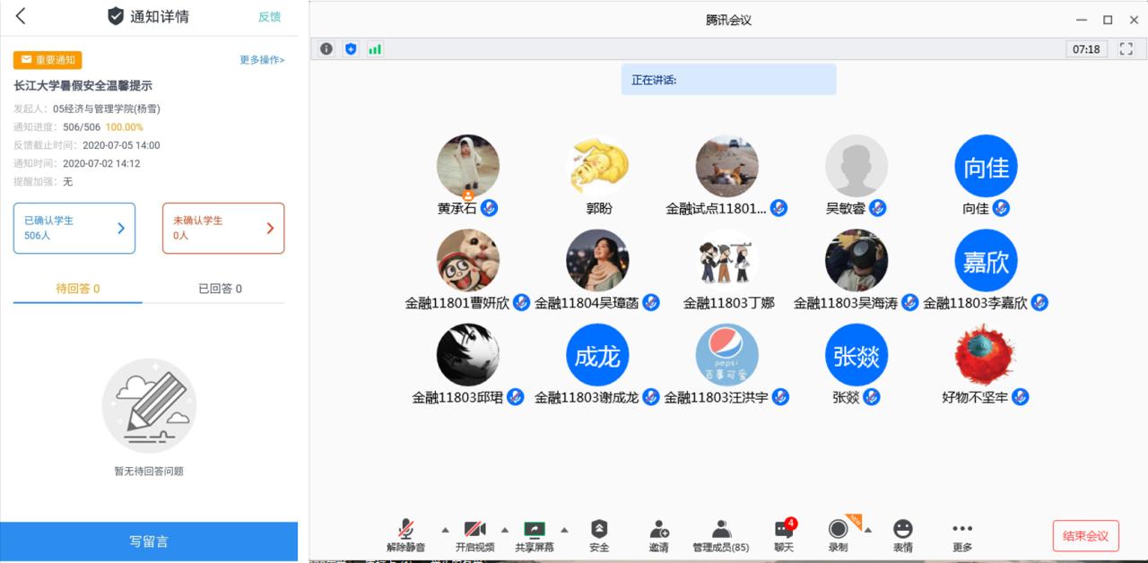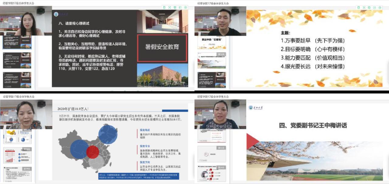 7月7日上午10点,经管公司2017级全体员工大会通过视频会议形式召开。会议以“安全·就业·考研”为主题,公司2017级940余名员工在云端参加了会议。会议上,2017级年级辅导员杨雪向全体员工传达了暑假期间公司的相关管理规定,并再次强调暑假安全注意事项。就业专干李博以“恋爱关系”类比就业工作,向员工传达“趁早、明确、匹配、长远”的就业观。副经理裴潇,围绕公司研究生教育概况、招生政策及推免政策三个方面,详尽讲解了研究生相关工作。会议最后,党委副书记王中梅向2017级全体同学表达了谆谆告诫和殷殷期盼之情,强调应关注学分,确保人人顺利毕业;注意假期安全,平安迎接开学;做好未来规划,迎接美丽人生。