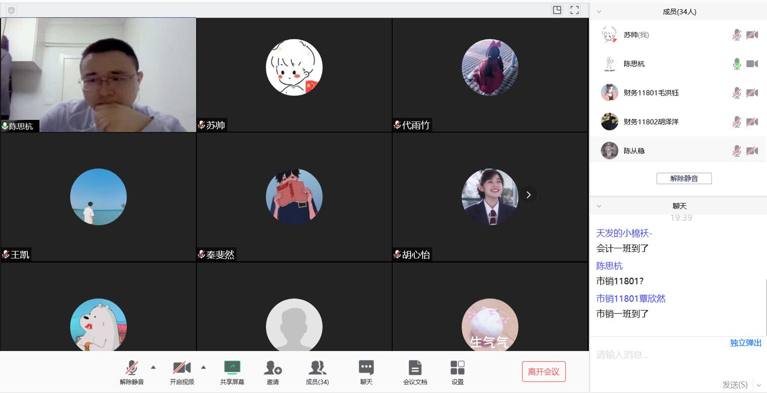 围绕“当前疫情形势”、“开学情况”、“网课”、“两个强调”四个方面,陈老师首先从分析我国及全球疫情形势开始,集中讲解了为什么要做好打持久战的准备!其次,围绕当前各大高校开学情况进行分析和讲解,分析了当前开学所面临的困难及挑战,介绍了湖北省高校坚持全省一盘棋的战略方针,讲解了现开学面临的复杂程序以及繁杂手续,让我们保持好心态,耐心等候公司和辅导员通知!此外,提醒大家调整好状态,做好每周晚点名工作和线上摸排工作,摸排好每一位班级同学的状况及需求,实时反映报告异常情况,做好线上汇报工作!