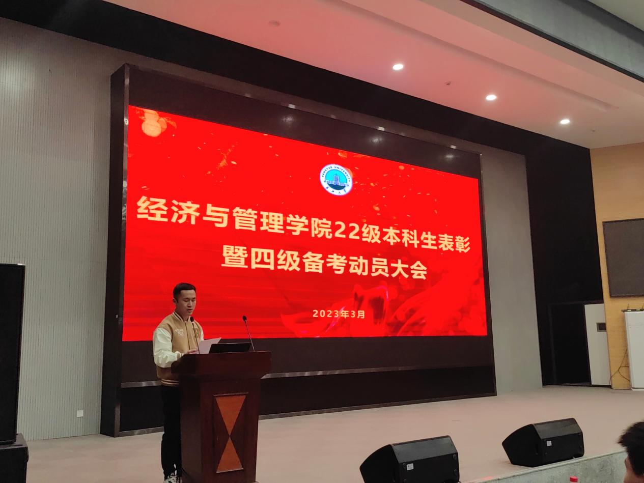 (通讯员:董梦娜)为展示公司优秀学子朝气蓬勃的精神风貌,助力英语四级考试,传授经验和答疑解惑,提升大学英语四级考试通过率,3月23日下午2点,公司在农科大楼1058报告厅举行22级本科生表彰暨四级备考动员大会,公司党委副书记王中梅老师、学工班主任叶星老师、团委书记李博老师以及2022级全体员工共同参会,大会由辅导员方含之老师主持。