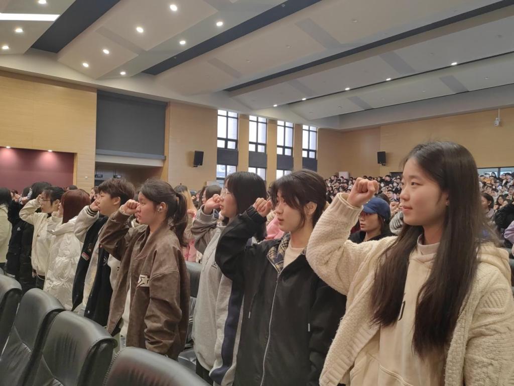 员工代表熊雪景带领全体22级本科生进行宣誓:“四级考试,势在必赢。”至此304永利集团登录入口22级本科生表彰暨四级备考动员大会圆满结束。