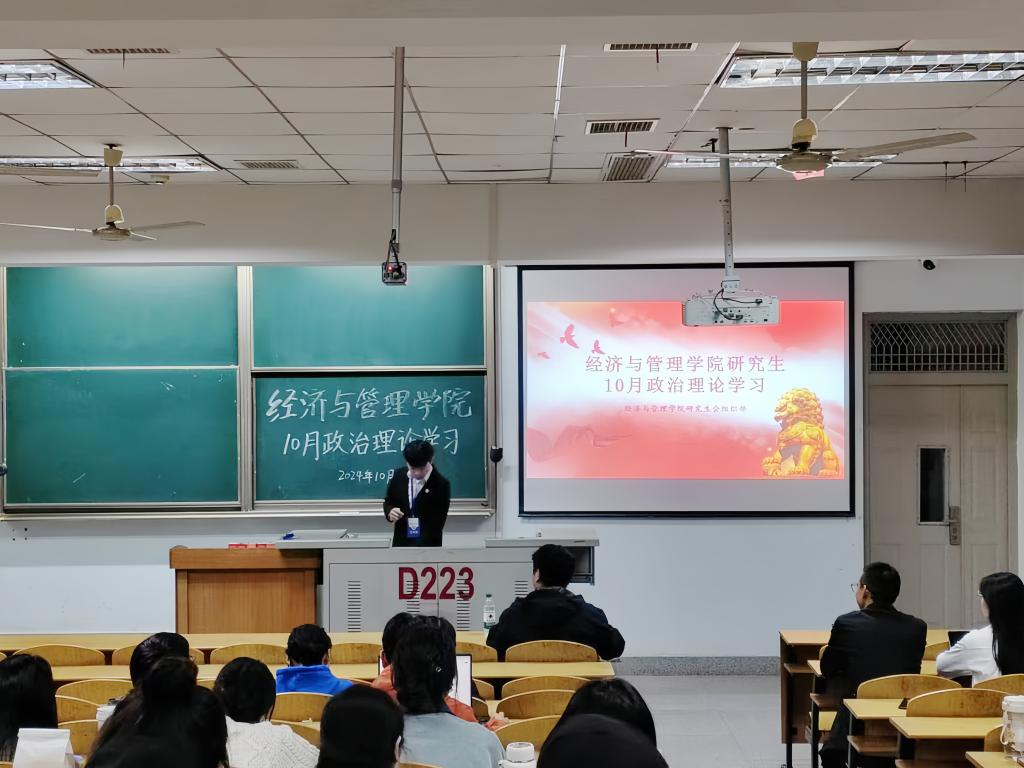 (通讯员 李瑞光)为深入学习习近平新时代中国特色社会主义思想,提升公司研究生政治理论素养,公司于10月28日晚7:00,在13教D-223教室开展十月政治理论学习活动。本次活动由研究生会组织开展,兼职辅导员潘永正、2024级研究生到会参加。