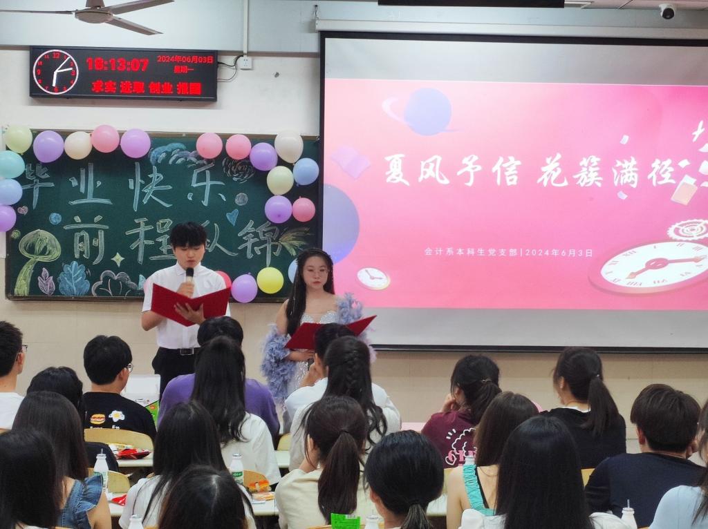 (通讯员 彭文桦/文 冯亚枝 任爽/摄)在2024届本科生毕业之际,为表达对毕业生党员们的真切感激与美好祝愿,勉励他们不忘来时路,奋进新征程,304永利集团登录入口会计系本科生党支部于2024年6月3日在12教103举办“夏风予信,花簇满径”主题欢送会。党支部书记桂凯丽、员工辅导员方含之以及党支部全体员工党员参加本次欢送会。
