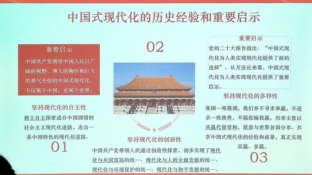 在“青年选择”这一学习板块,郭斯齐同志以青年宋玺,宋彪,于逸飞,周承钰的成长经历为榜样事例,号召在座的党员同志将个人发展与国家、社会的需求相结合,敢作敢为、勇于追梦,将火热青春融入时代洪流中。紧接着会议解读了中国式现代化的历史经验和重要启示。大家纷纷表示,要坚持现代化的自主性,创新性,多样性,大力推进中国式现代化。