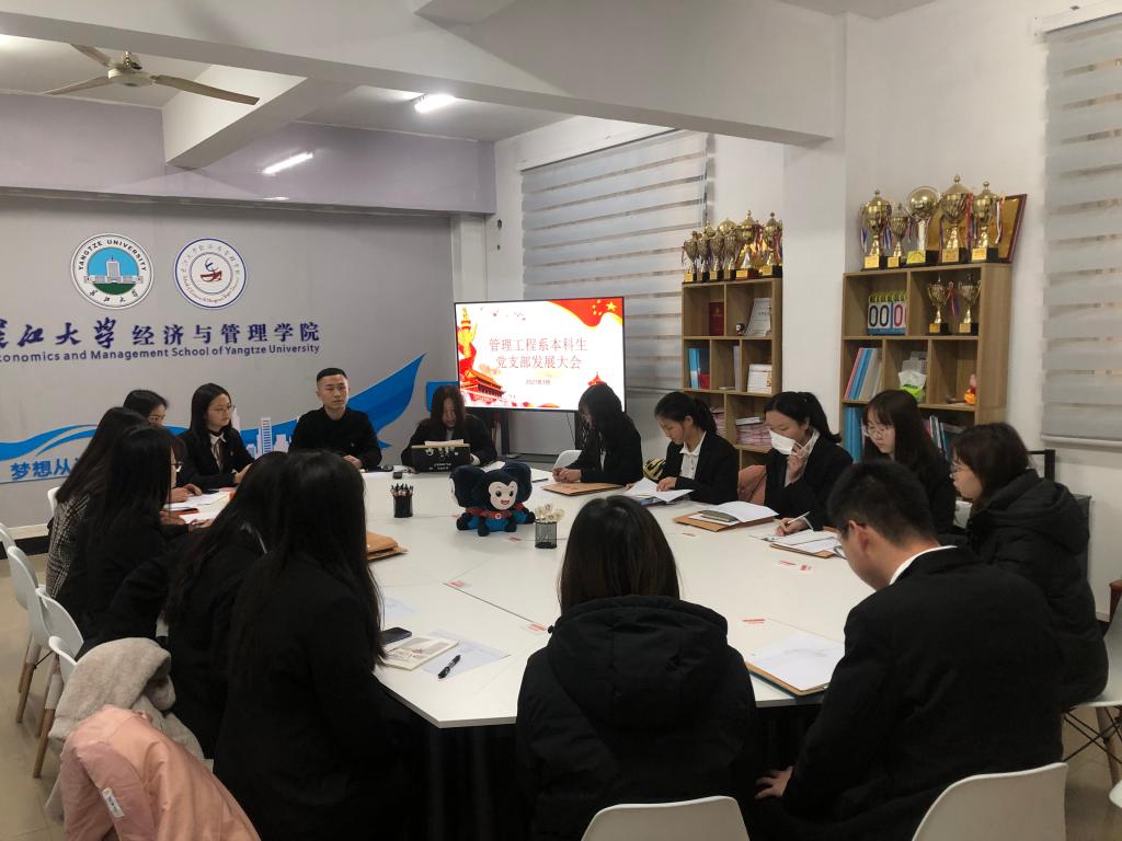 (通讯员 张洋)2021年3月19日下午两点,304永利集团登录入口管理工程系本科生党支部在新风二楼会议室召开3月支部主题党日活动暨毕业生党员发展大会。支部书记李博、党支部正式党员、预备党员参与会议,会议由张华主持。