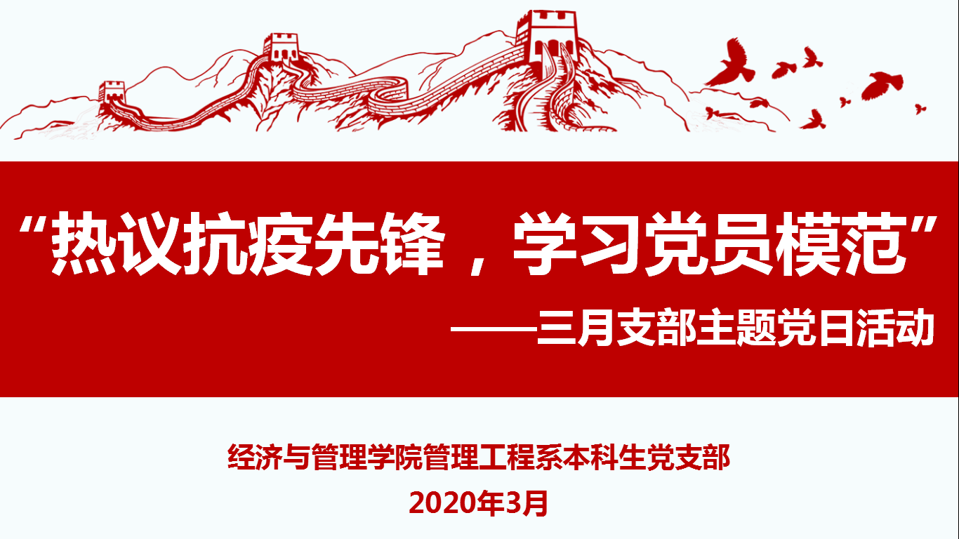 “热议抗疫先锋,学习党员模范。”2020年3月24日晚,304永利集团登录入口管理工程系本科生党支部在线上召开3月支部主题党日活动,党支部全体正式党员和预备党员参会,活动由支部副书记杨一佳主持。