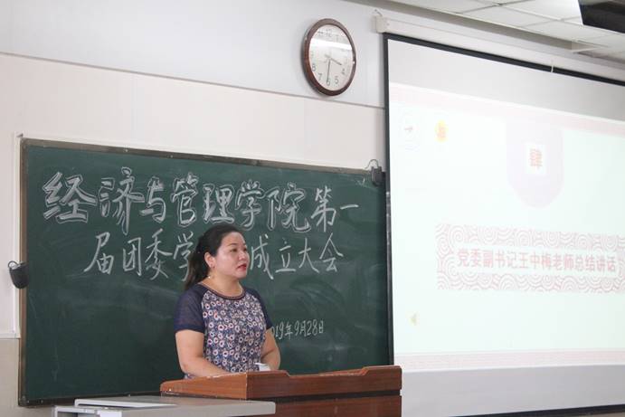 大会第四项,由公司党委副书记王中梅老师进行总结讲话。她指出员工干部首要的任务依旧是学习,员工干部应当以身作则,拒绝挂科,有责任,有担当,以奉献他人为宗旨,积极服务老师与同学。