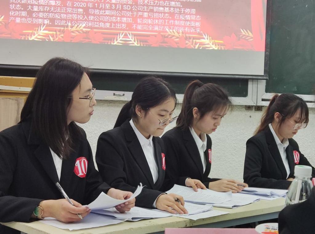 本次比赛决赛的是在初赛的十支队伍中经过复赛的选拔最终挑选出来的四支队伍。比赛伊始,主持人宣讲比赛规则;第一场由一组资方与一组劳方进行商谈,时间规定为50分钟,双方就公司因为疫情以及其他公司竞争等原因而调整工作时间和工资等问题展开协商谈判。如何确定最优调整措施,如何得到劳方资方都满意的结果,双方进行了激动人心的谈判。谈判过程中最重要的是有较强的心理素质和应变能力,避免造成双方进入僵局,并且要懂得尊重维护彼此双方的尊严和利益,这些都在决赛现场的选手们身上得到了应有的表现。最后得出双方都满意的答复。中场休息五分钟,有与观众进行的一个互动环节,抽奖问答。第二场比赛接着进行,换由另一组劳方资方进行协商谈判。