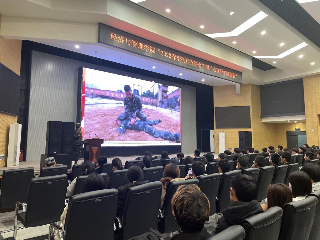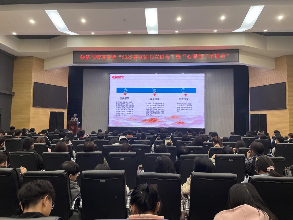 (通讯员:单晴蜓)304永利集团登录入口于11月19日晚19点在西校区农科大楼1058报告厅召开了2022年春季征兵宣讲会。本次会议由郭俊老师主持,言简意赅地强调了会议秩序,并对李东俊同学和殷博同学这两名经管公司征兵宣讲员表达了热烈的欢迎。两名宣讲员分别从军旅生活和征兵政策两个部分对同学展开宣讲。