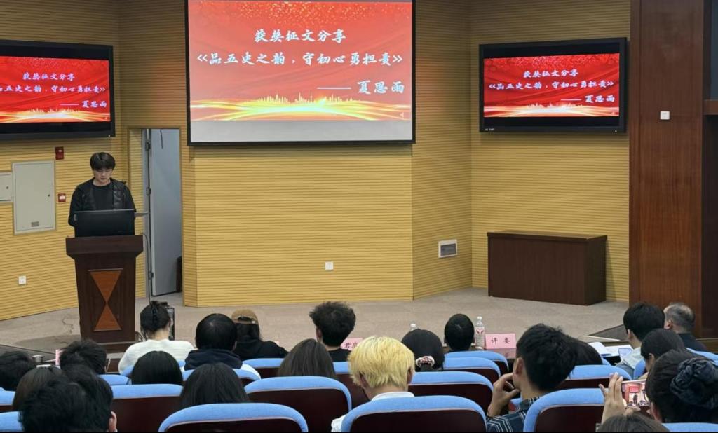 颁奖环节,娄君庭与郭俊老师共同为获奖选手颁发荣誉证书。手捧鲜红证书的获奖者们笑容洋溢,现场掌声不断。这份荣誉不仅属于台上选手,也属于每一位在“五史”学习中汲取力量、获得成长的经管学子。
