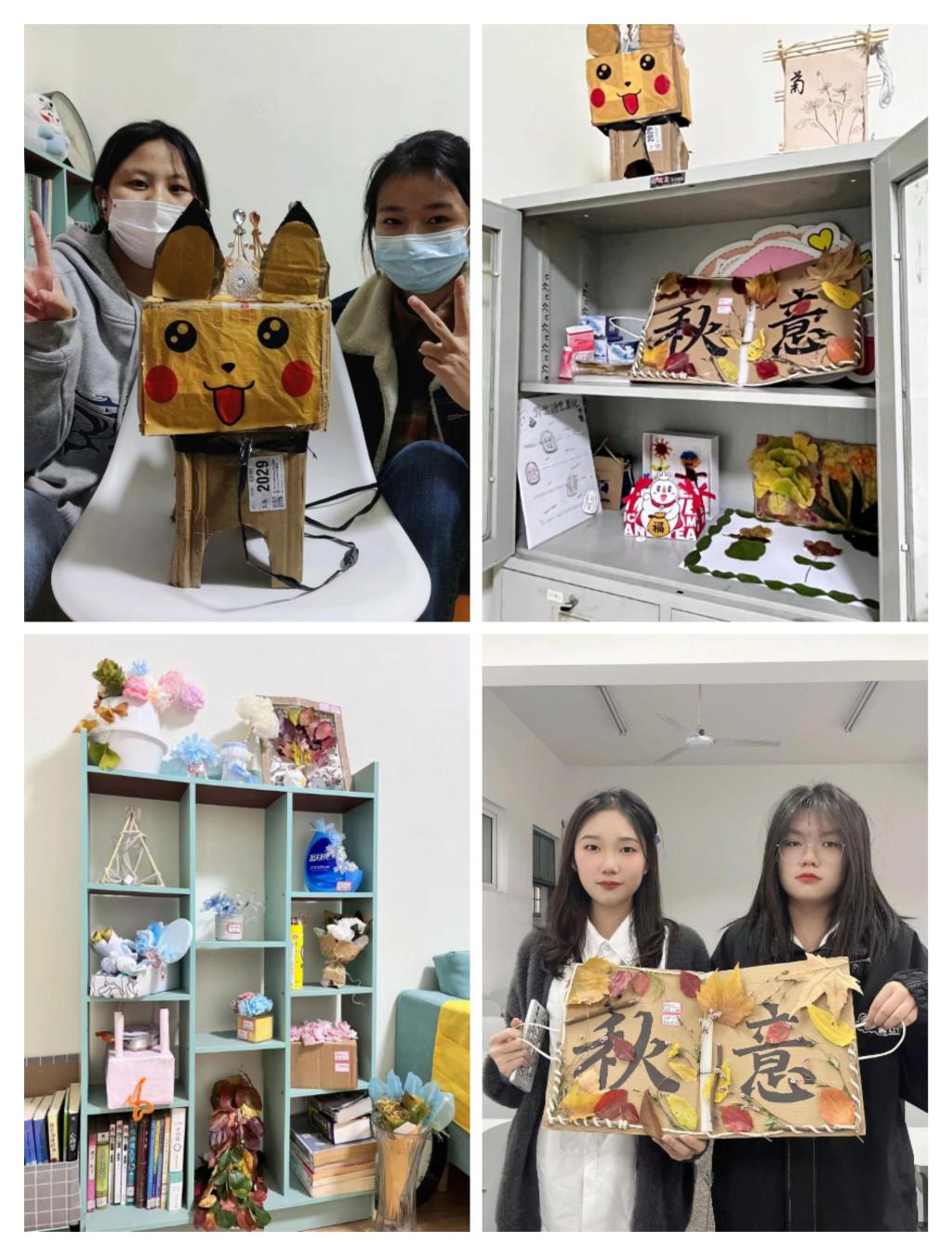 活动现场,同学们相约一起构思作品,通过手中材料并结合个人思考,大胆创新,有用废弃纸箱做的“废纸小狗”,有树叶与卡纸制作的“落叶秋画”与“树叶书签”,还有用废纸与水瓶做“蝶恋花”花篮等。思维的碰撞产生不少充满生命力的作品,现场氛围逐渐热烈起来。