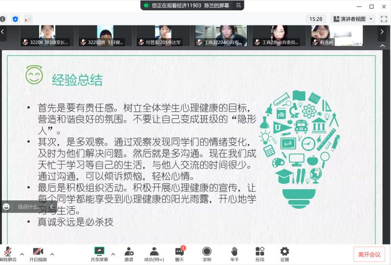疫情封校中的老员工,你是否还在为不知如何开展心育活动而烦恼?你是否还在因无法走进同学内心而头痛?你是否还不清楚如何履行心理骨干之责任?针对这些疑问与困惑,经济11903班心育委员陈兰结合自身的学习与工作经历,围绕“心交流、心陪伴、心互助”与新生骨干展开分享。首先,陈兰向同学们分享自己在班级组织开展的一系列心育工作,如关注同学动态,做好工作记录、坚持在班级群发送每天的早晚安心语,生日祝福,营造班级温暖友爱的氛围、带领同学们积极参加学习培训,掌握心理健康知识、组织班级同学召开心理健康主题班团会等。
