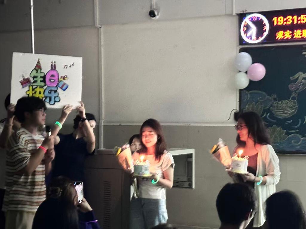 除了精彩的文艺表演,晚会还特别设计了多个互动小游戏环节,如结合专业特色的“指尖‘钞’能力”点钞比赛、考验观察与表达能力的“伪装者挑战”、紧张有趣的“寻‘爆’大挑战”以及“声初辨金曲”猜歌环节等。游戏不仅拉近了同学之间的距离,更将现场气氛一次次推向高潮。参与游戏和才艺展示的同学均有机会参与抽奖,赢取便利贴、笔记本、日用礼品等丰富奖品。当晚,晚会特别设置了一个温馨环节——为两位恰逢生日的2023级同学举行了简朴而真挚的集体生日庆祝仪式。在全场师生齐唱《生日快乐》的歌声中,两位“寿星”惊喜上台,接受来自公司和同学们的诚挚祝福。这份突如其来的温暖,不仅让过生日的同学感动不已,也让所有在场师生感受到经管公司大家庭的关怀与情谊,将晚会推向情感的高潮。