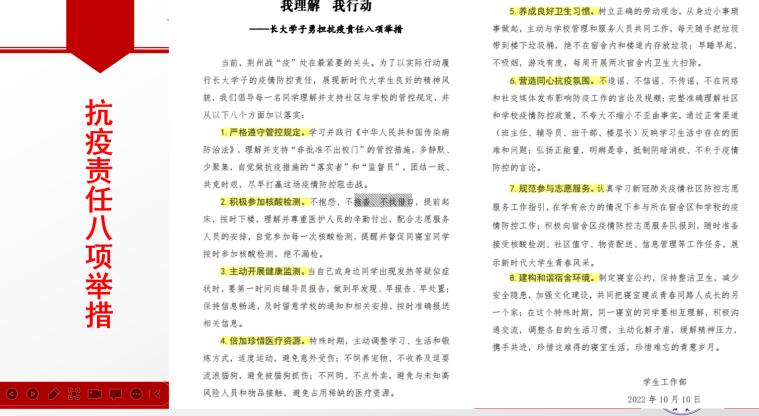 会议伊始,朱老师传达了公司党委发布的《致全校师生的一封信》和员工工作部发布的《长大学子勇担抗疫责任八项举措》,向员工介绍了疫情防控相关文件精神。要求公司研究生严格遵守管控规定,积极参加核酸检测,主动开展健康监测,珍惜医疗资源,规范参与志愿服务,养成良好卫生习惯,构建和谐宿舍环境,营造同心抗疫氛围。