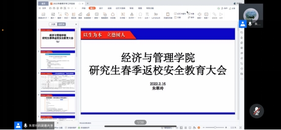 (通讯员:程思佳)为了落实公司2022年春季学期开学的相关工作,引导员工做好疫情返校期间的各项事宜,经管公司于2月16日下午4:00,通过腾讯会议召开研究生返校安全教育大会。全体研究生参加了本次会议,会议由辅导员朱翠玲老师主持。