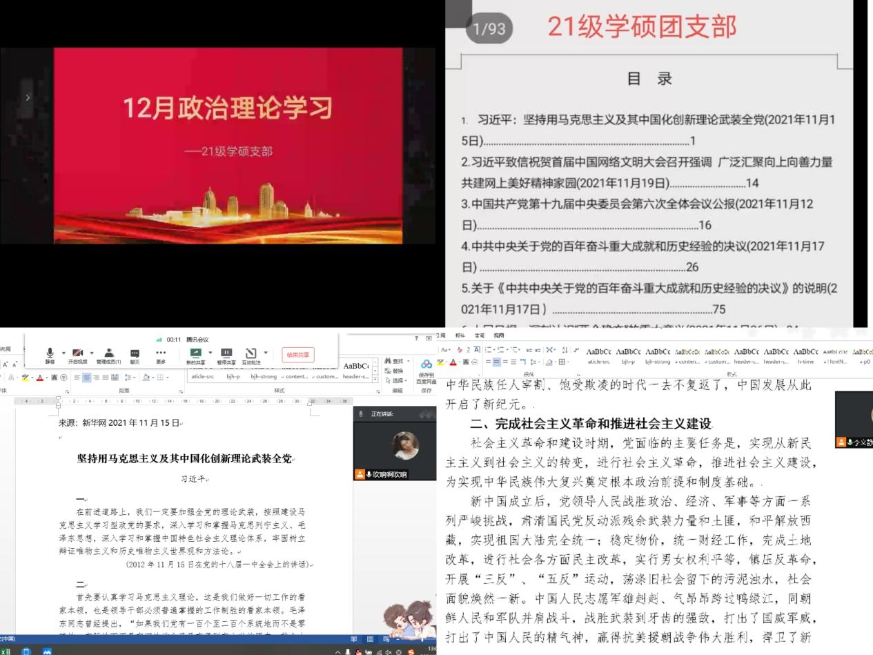 主要学习内容为:1.习近平:坚持用马克思主义及其中国化创新理论武装全党;2.习近平致信祝贺首届中国网络文明大会召开,强调广泛汇聚向上向善力量共建网上美好精神家园;3.中国共产党第十九届中央委员会第六次全体会议公报;4.中共中央关于党的百年奋斗重大成就和历史经验的决议;5.习近平:关于《中共中央关于党的百年奋斗重大成就和历史经验的决议》的说明;6.人民日报:深刻认识“两个确立”的重大意义;7.党史、新中国史、改革开放史、社会主义发展史重点篇章学习。
