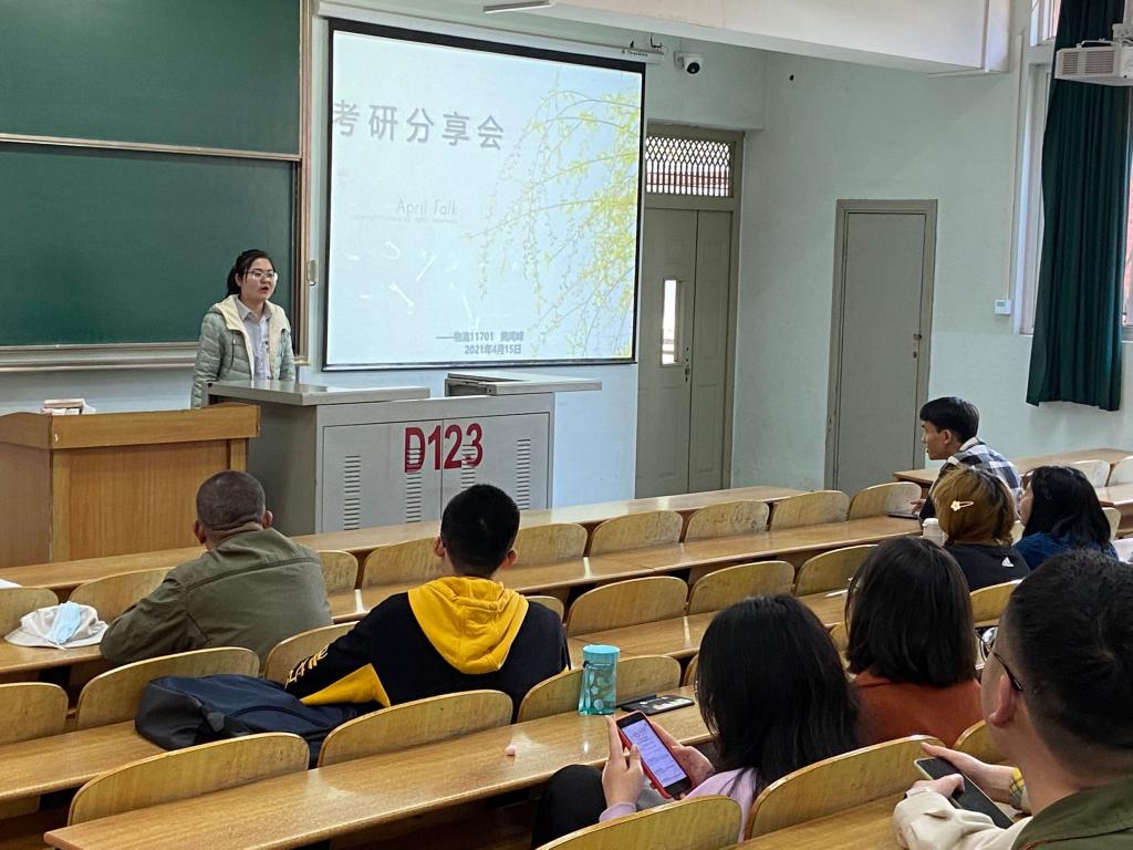 交流会上,项娟学姐对考研的经历路程,经历坎坷,自己解决方法,对同学进行了详细的分享;程守文学长分享了自己的学习规划,每一阶段,每一时期,要学什么,以及所用书籍,让同学们豁然开朗;熊闻峰学姐就自己的择校选择,备研网站,以及自己的坚持,让同学们受益匪浅。会中还有同学们的提问环节,针对大家提出的问题,学长学姐们进行了详细的解答。辅导员李博老师也对大家提出了建议,“不好高骛远,不妄自菲薄”。班主任帅老师也给大家大气,鼓励大家积极备考,迎难而上。