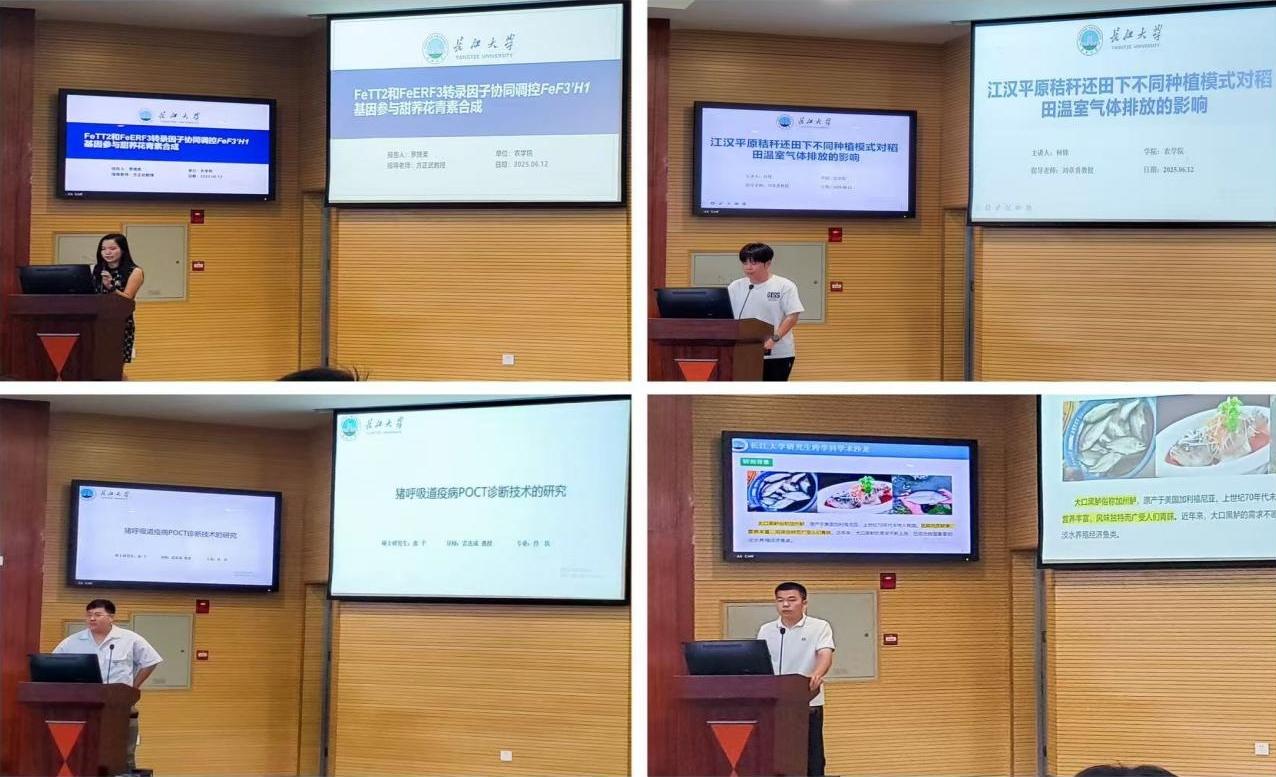 随后,八位主讲人依次登台,结合自身研究领域,带来了一场场精彩纷呈的学术分享。农公司的罗旖柔以《FeTT2和FeERF3转录因子协同调控FeF3'H1基因参与甜荞花青素合成》为题,深入探讨了甜荞花青素合成的分子机制;何锋则聚焦《江汉平原秸秆还田下不同种植模式对稻田温室气体排放的影响》,为农田温室气体减排提供了新思路。动物科学技术公司的杨艳林和张千分别就《浊度对大口黑鲈生长、抗氧化、组织学及视觉功能的影响》和《猪呼吸道疫病POCT诊断技术的研究》进行了精彩汇报,展示了水产养殖和兽医领域的最新进展。