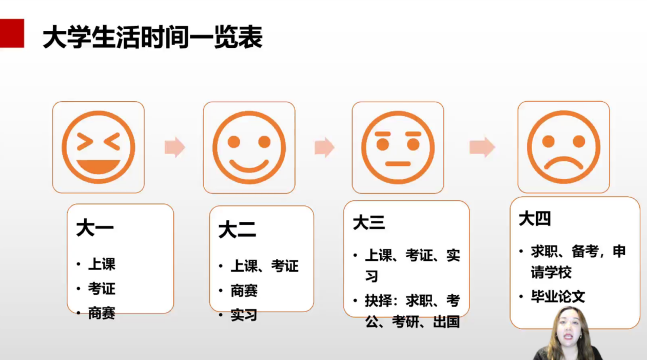 Candice老师从老员工考研及就业形势解读、商科学子的能力提升方向、大学期间时间规划三方面进行讲解,通过引用报考、就业数据和企业能力要求,全方位阐述了现阶段经管学子面对的风险挑战与应对策略。