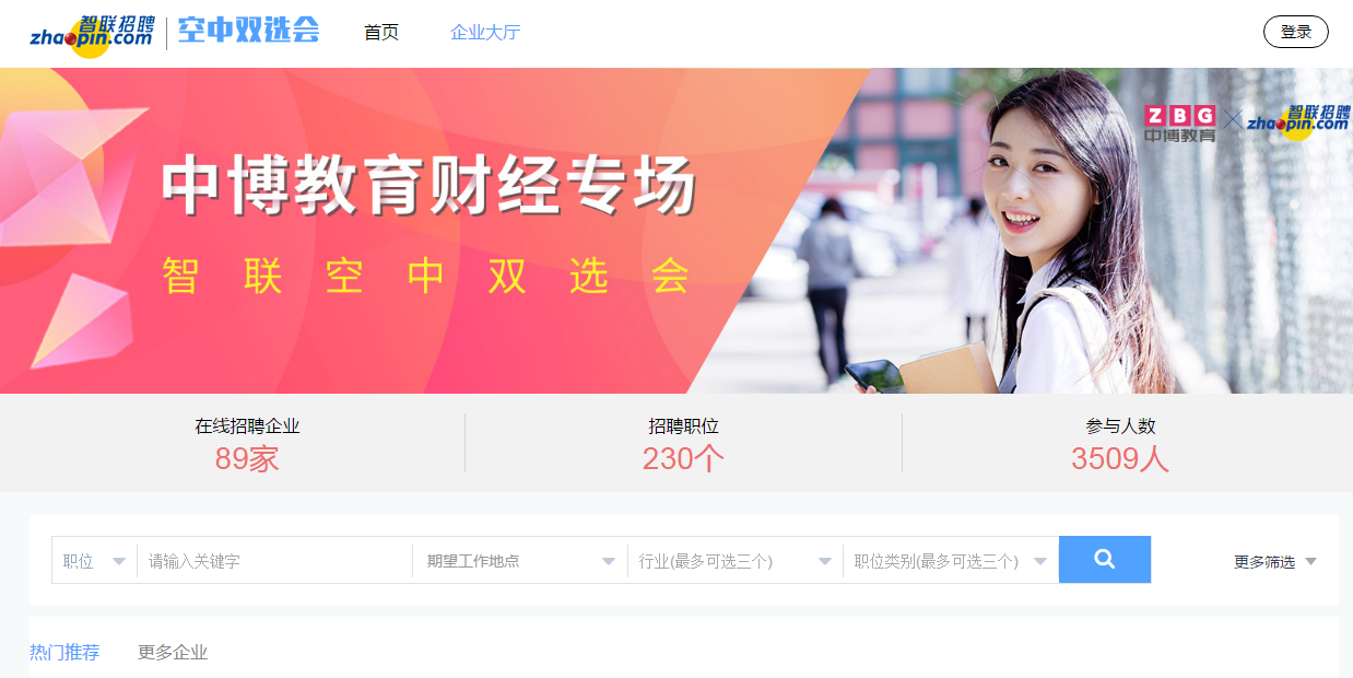 本次中博教育携手智联招聘重磅推出财经专场空中双选会,针对经管老员工,精选众多财会及金融类职位,推荐优质岗位资源。不仅有包括八大在内的会计师事务所,国企、明星民营企业、优质外企也尽在其中。各位求职老员工进入空中双选会页面后,直接选择心仪企业投递简历、在线留言HR可面试时间,等待HR联系确定时间后,便可进行线上视频面试,为毕业生求职提供了极大的便利。